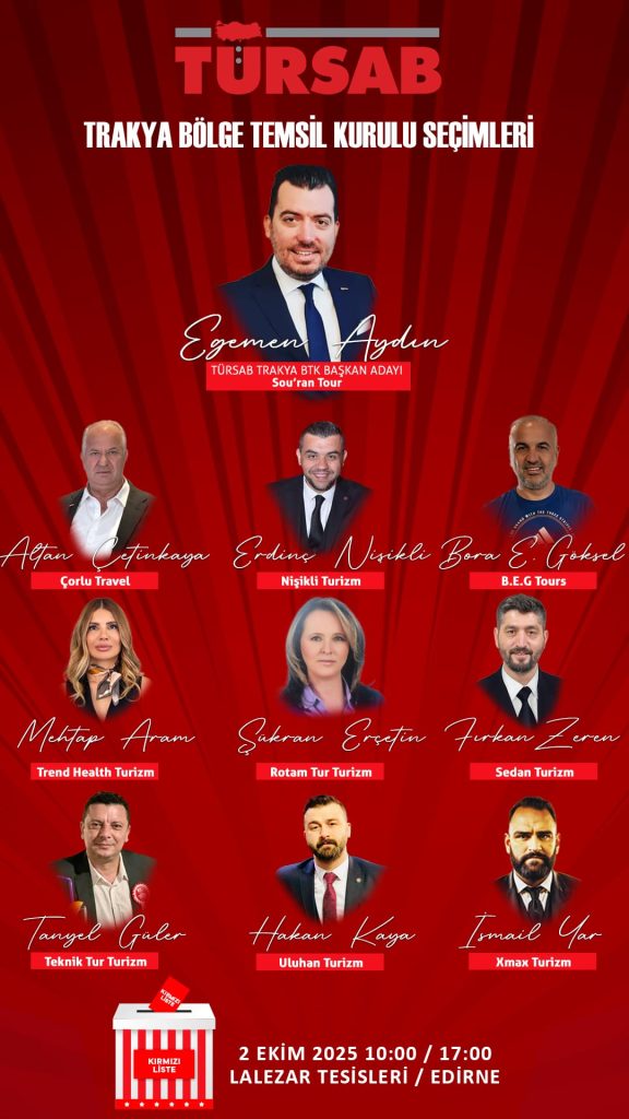 TÜRSAB Trakya Bölge Temsil Kurulu, 2 Ekim 2025 Perşembe günü “Seçim Gündemli Trakya Bölge Temsil Kurulu Toplantısı” için bir araya geliyor. Üç yılda bir yapılan seçimler bu yıl Edirne’de, Lalezar Tesisleri’nde gerçekleştirilecek.
