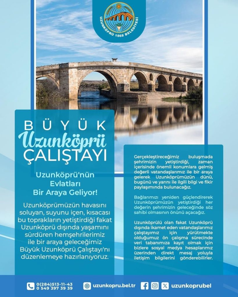 Büyük Uzunköprü Çalıştayı düzenleniyor. Uzunköprü Belediyesi tarafından düzenlenecek olan çalıştayda Uzunköprü’nün tarihi, bugünü ve geleceğinin konuşulması hedefleniyor.