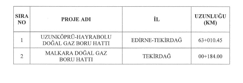 Cumhurbaşkanı kararıyla, Edirne’nin Uzunköprü, Tekirdağ’ın Hayrabolu ve Malkara ilçelerinde yapılacak doğal gaz boru hattı projeleri için bazı taşınmazların Boru Hatları ile Petrol Taşıma Anonim Şirketi (BOTAŞ) tarafından acele kamulaştırılmasına hükmedildi. Karar, Resmî Gazete’de yayımlandı.