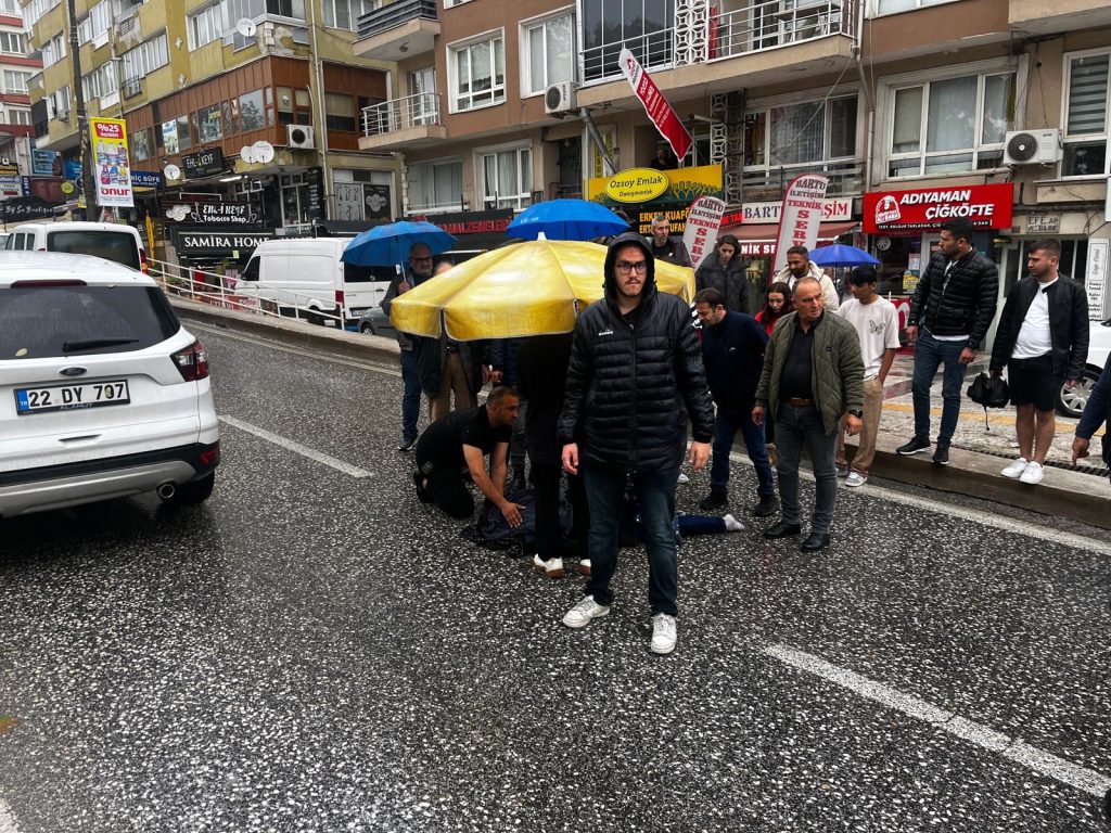 Edirne’de yaya geçidinde otomobilin çarpması sonucu yaralanan 56 yaşındaki Nurgül Çemberli’ye çevredeki esnaf yardım eli uzattı. Kuvvetli yağmur altında kalan yaralı kadını ıslanmaması için şemsiye ile koruyan esnaf, üşümesin diye üzerine mont örttü.
