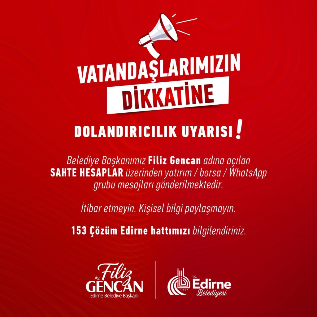 Edirne Belediyesi, Belediye Başkanı Filiz Gencan’ın adı kullanılarak açılan sahte hesaplar üzerinden yatırım ve borsa içerikli dolandırıcılık mesajları gönderildiğini belirterek, vatandaşları bu tür girişimlere karşı uyardı.