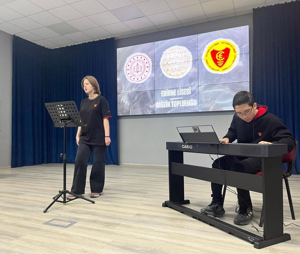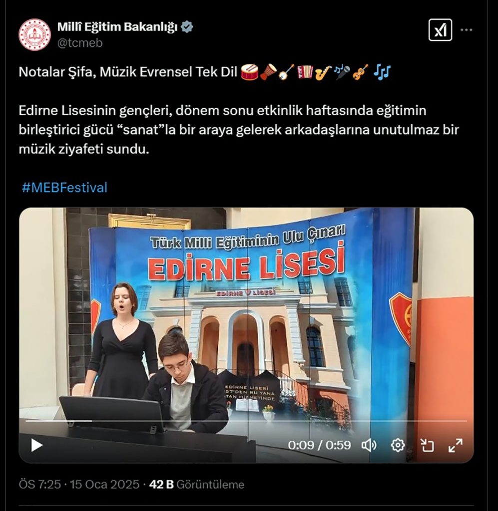 Edirne Lisesi’nde okuyan 15 yaşındaki 9’uncu sınıf öğrencisi Ekin Arda, okulun dönem sonu etkinlikleri kapsamında aynı sınıfta okuyan arkadaşı Kubilay Doruk Akay’ın piyanoyla eşlik ettiği ‘Aşk’ isimli parçayı seslendirdi. Türkiye’nin en eski eğitim kurumlarından birinde eğitim gören Arda ve Akay’ın seslendirdiği eseri kayda alan öğretmenleri, görüntüleri Milli Eğitim Bakanlığı’na gönderdi. O anlar 15 Ocak tarihinde bakanlığın sosyal medya hesabından "Notalar Şifa, Müzik Evrensel Tek Dil. Edirne Lisesinin gençleri, dönem sonu etkinlik haftasında eğitimin birleştirici gücü 'sanat'la bir araya gelerek arkadaşlarına unutulmaz bir müzik ziyafeti sundu" ifadeleriyle paylaşıldı.