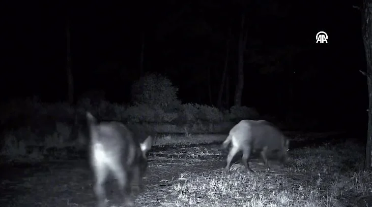 Gece saatlerinde tek tek beliren domuzların doğal yaşamı fotokapana yansıdı. (AA)